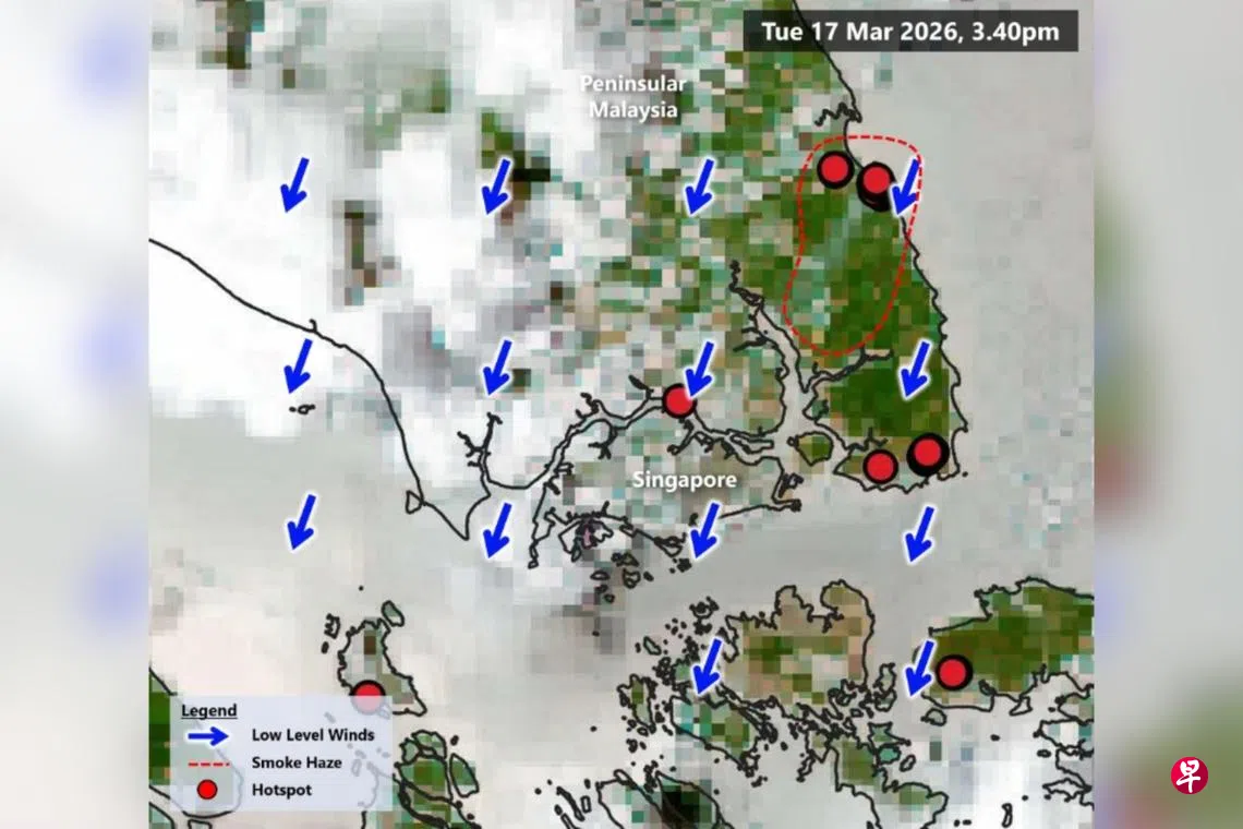 根据国家环境局星期二(3月17日)的脸书贴文,当局观测到柔佛东部一个热点冒出的烟羽(smoke plume)正飘向新加坡。