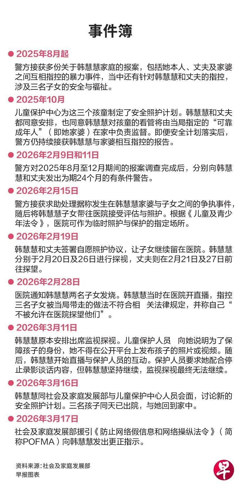 社运分子韩慧慧在社交媒体多次发布子女被当局带离家中过程的不实信息,包括指称当局未按照正当法律程序并试图永久剥夺她探视孩子的权利,社会及家庭发展部向韩慧慧发出更正指示。