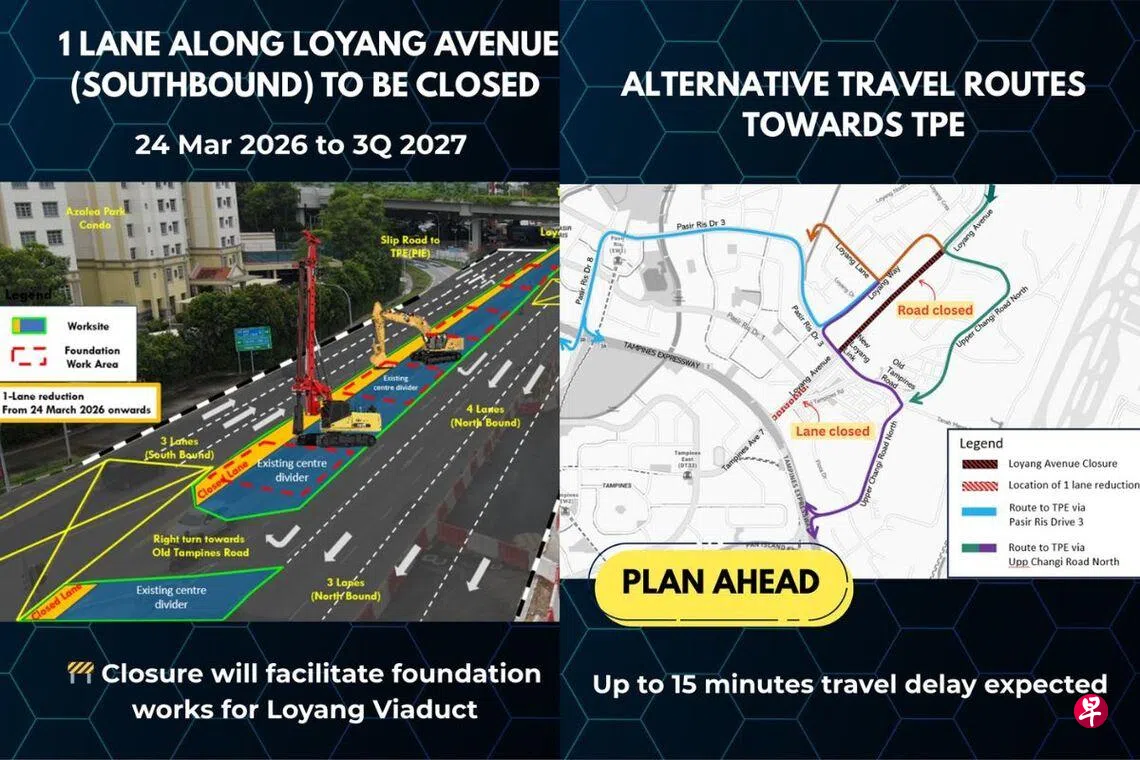 为进行罗央高架桥的地基工程,往南方向的罗央道(Loyang Avenue)四条车道中的最右边车道将从下星期二(3月24日)起关闭,直至2027年第三季。