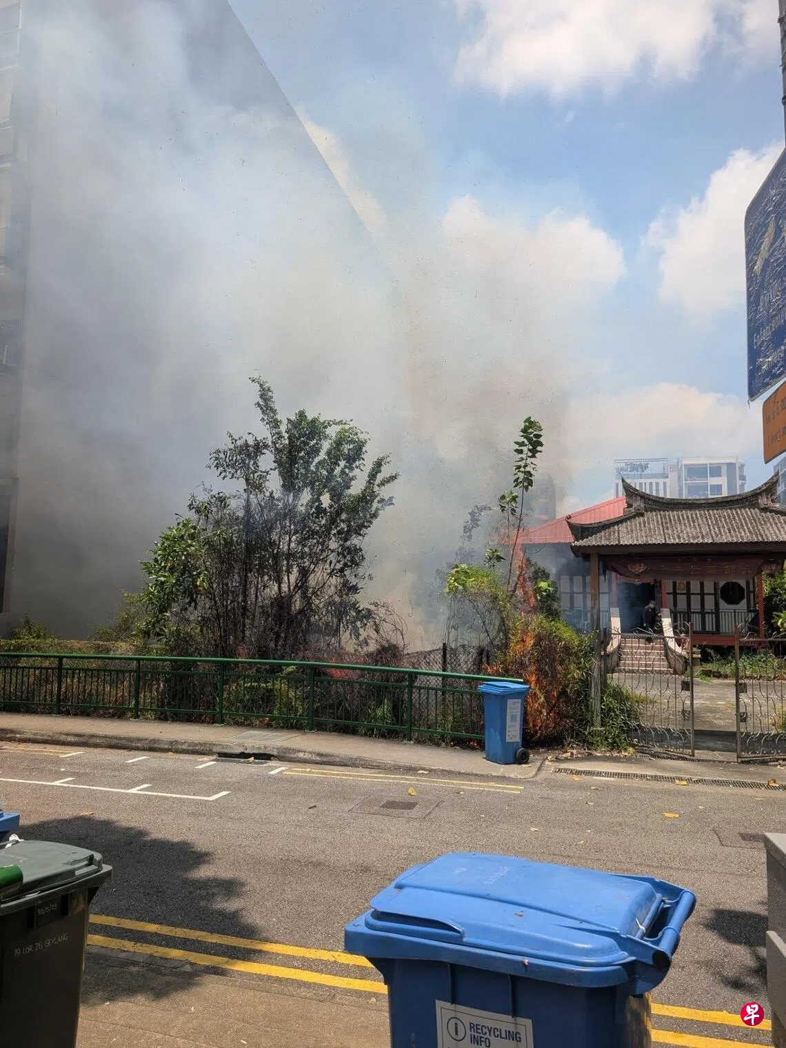 芽笼一间寺庙的草丛起火,现场不断冒出阵阵白烟。 (取自蔡引舟脸书)