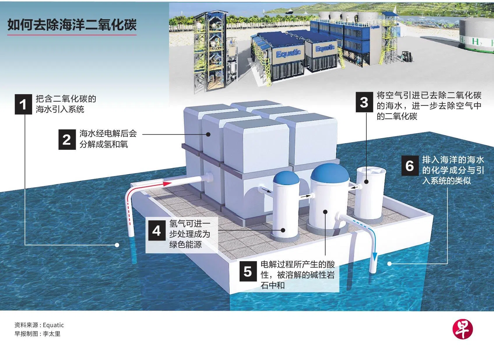 新厂用电解处理公用局海水淡化厂提取的海水,含二氧化碳的海水加工去碳后,会与引入系统的空气混合。新厂把空气中的二氧化碳转移到已去碳的海水后,再把海水排入大海。捕获的碳会转化成钙和镁基的碳酸盐等封存至少1万年。