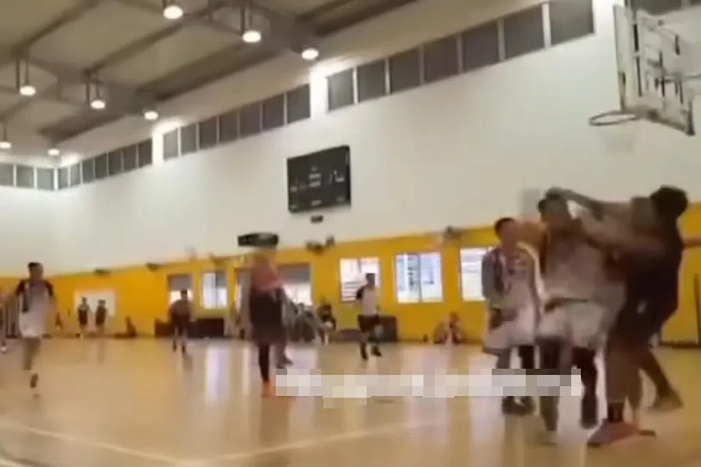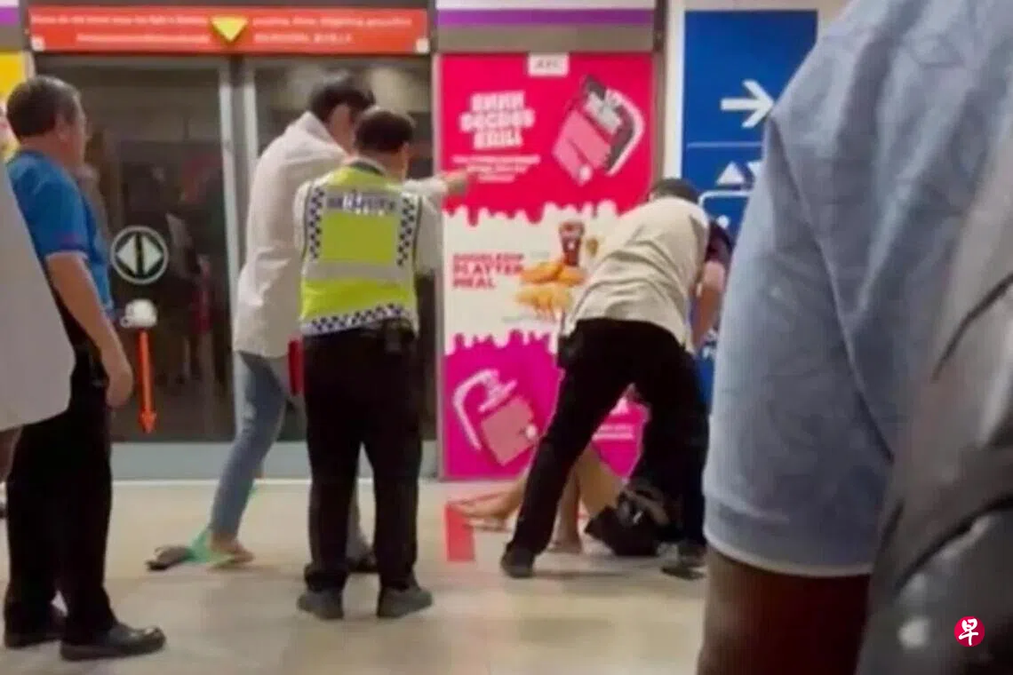 根据《海峡时报》上载的一段视频,一名身穿白色长袖衣的男子将背包扔下,随后向在地上的黑衣男子踢一脚。白衣男还因此被绊倒。