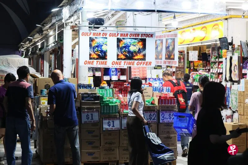 《新明日报》记者星期三(3月25日)晚上走访商店,发现靠近走道的角落上设有一个优惠区,上方悬挂着6至8张白色广告牌,搭配“海湾战争”、“一次性优惠”的红色字样,以及巨大的地球起火燃烧图案,相当显眼。