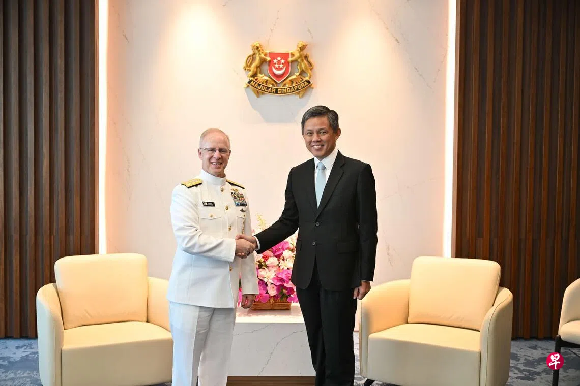 来新访问的美国海军作战部长考德尔上将,星期四(3月26日)会见公共服务统筹部长兼国防部长陈振声。双方在会晤中重申新美之间极佳且长期的防务关系。