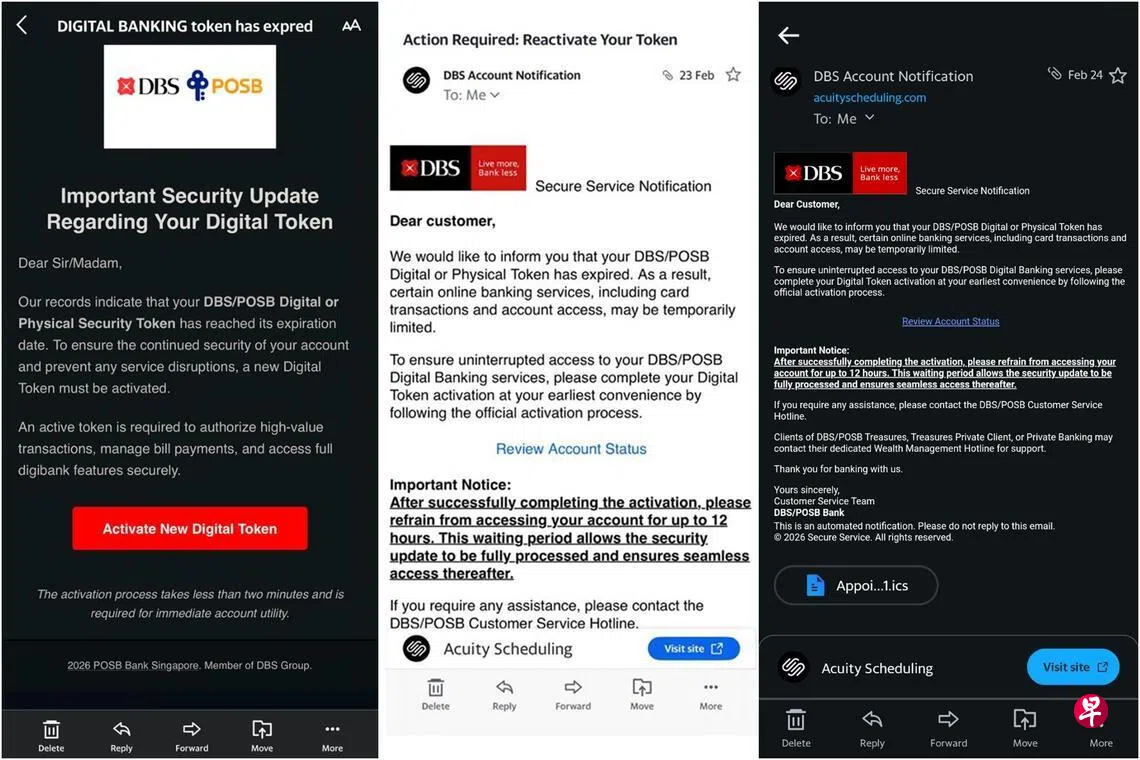 新加坡警察部队与星展银行星期五(3月27日)联合发文告说,在这类诈骗中,受害者会收到看似来自星展银行或储蓄银行的电子邮件,声称受害者的网络密码器(digital token)已过期,需要进行激活或更新。