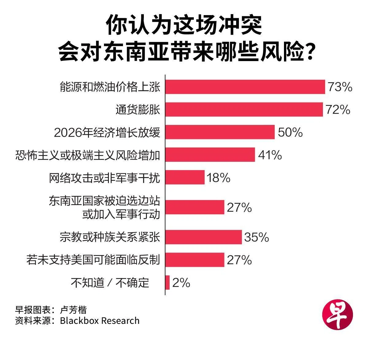 此外,35%认为冲突可能加剧宗教或族群紧张关系;另有27%担心,若新加坡未对美国行动表达足够支持,可能面对来自特朗普政府的反制。