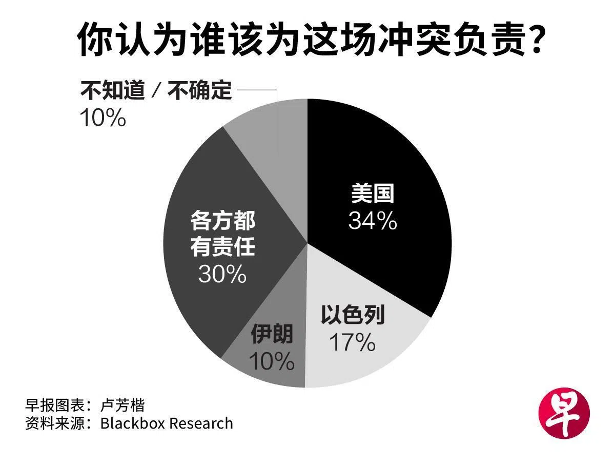 在责任归属上,34%受访者认为美国应负最大责任,17%指向以色列,仅10%归咎伊朗;另有30%认为,美以伊三方均须承担责任。
