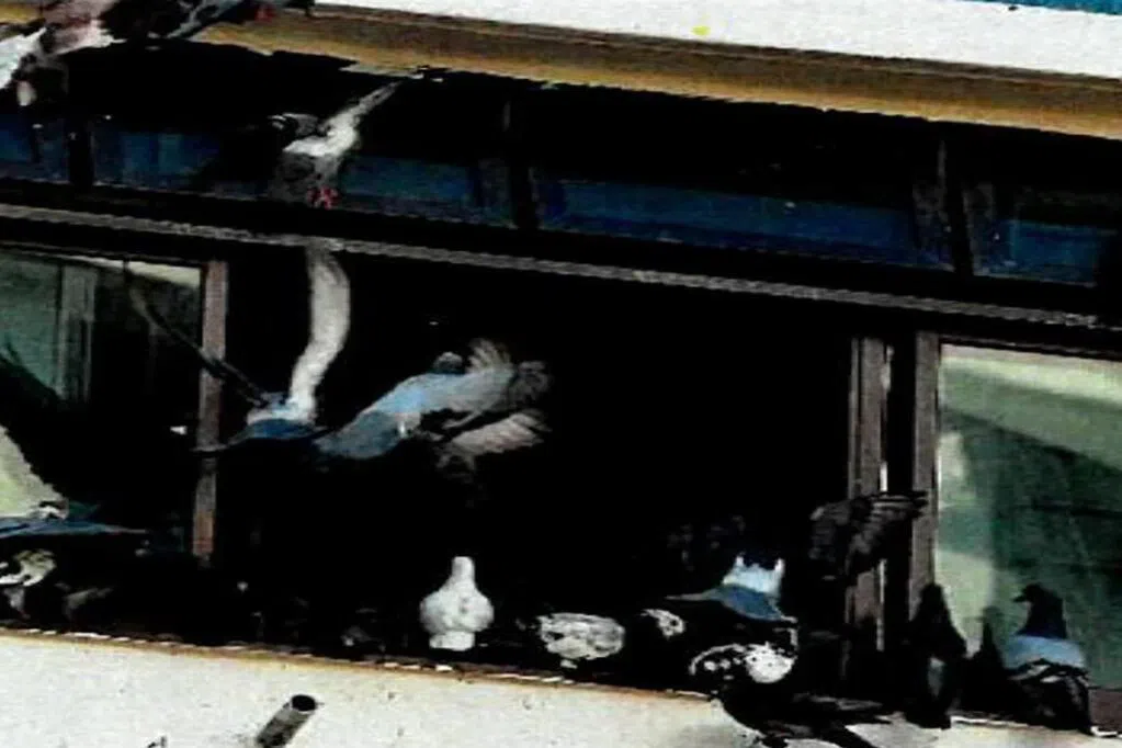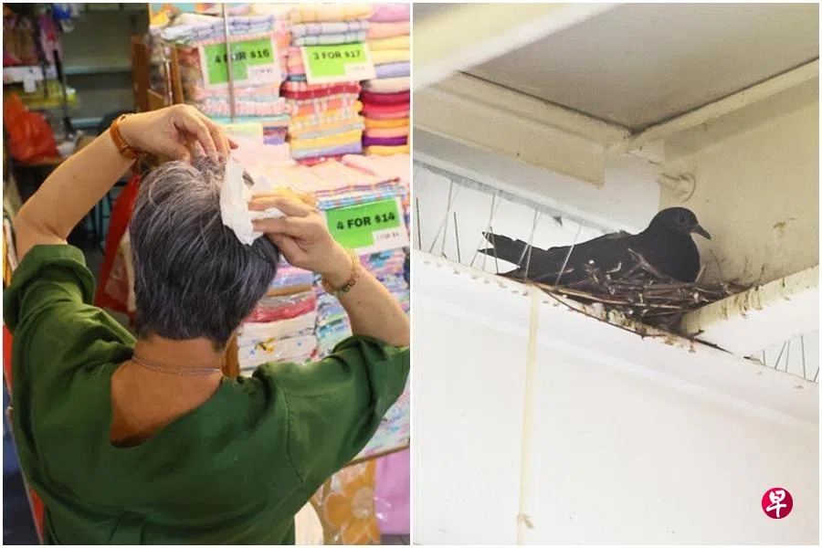 牛车水大厦内鸽子筑巢,疑搬家时还抛下“鸟粪弹”,一楼商家遭殃“中头奖”,摆卖的衣服也中招,生意更是因此锐减两成。