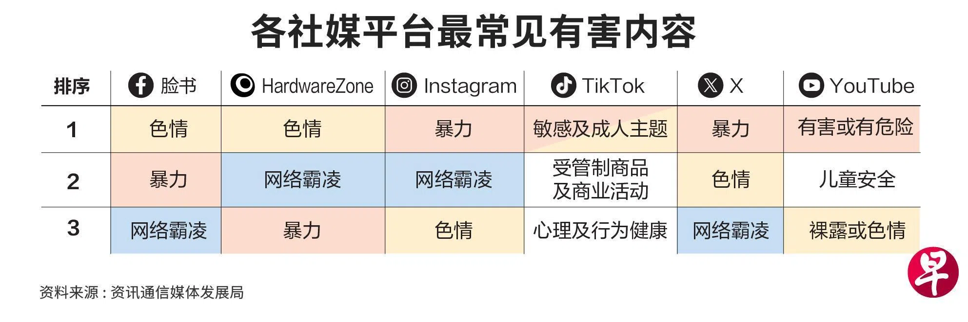 资讯通信媒体发展局星期二(3月31日)公布的网络安全评估报告,涵盖脸书、HardwareZone论坛、Instagram、TikTok、X,以及YouTube六个社媒平台。