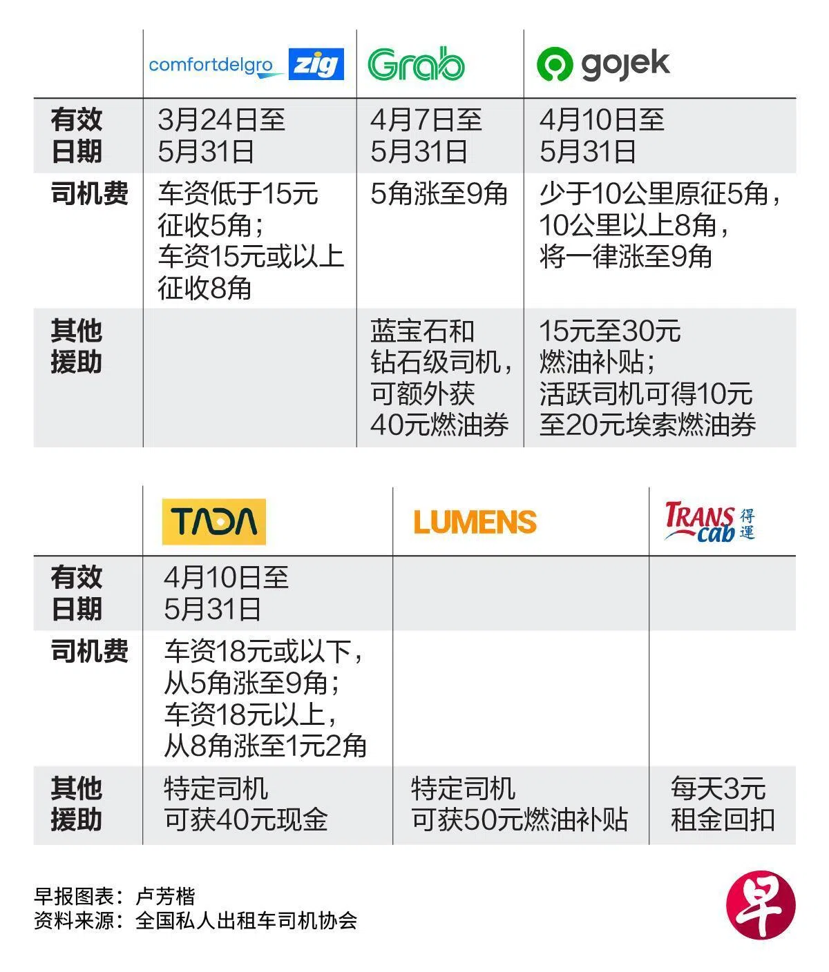 为协助司机抵消近期油价成本上涨,再有两家私召车业者暂时调高司机附加费,4月10日至5月31日,公众乘搭TADA和Gojek时须额外支付至少9角。司机费全数归给司机。