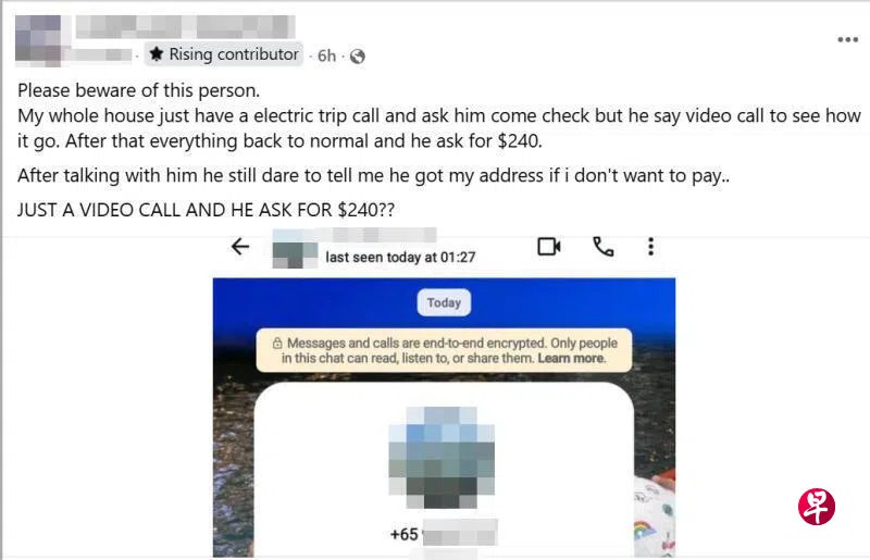 一名住户星期五(4月3日)在脸书群组Complaint Singapore贴文,指家中的电闸深夜突然跳电,导致电源中断,于是拨电找电工到场。