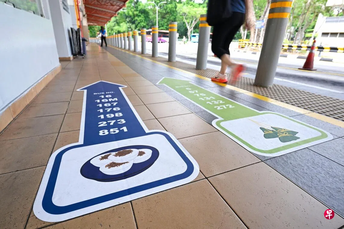 红山巴士转换站增设以肉粽、红桃粿和水粿为主题的怀旧图案标识,协助失智症者辨认回家的巴士方向。