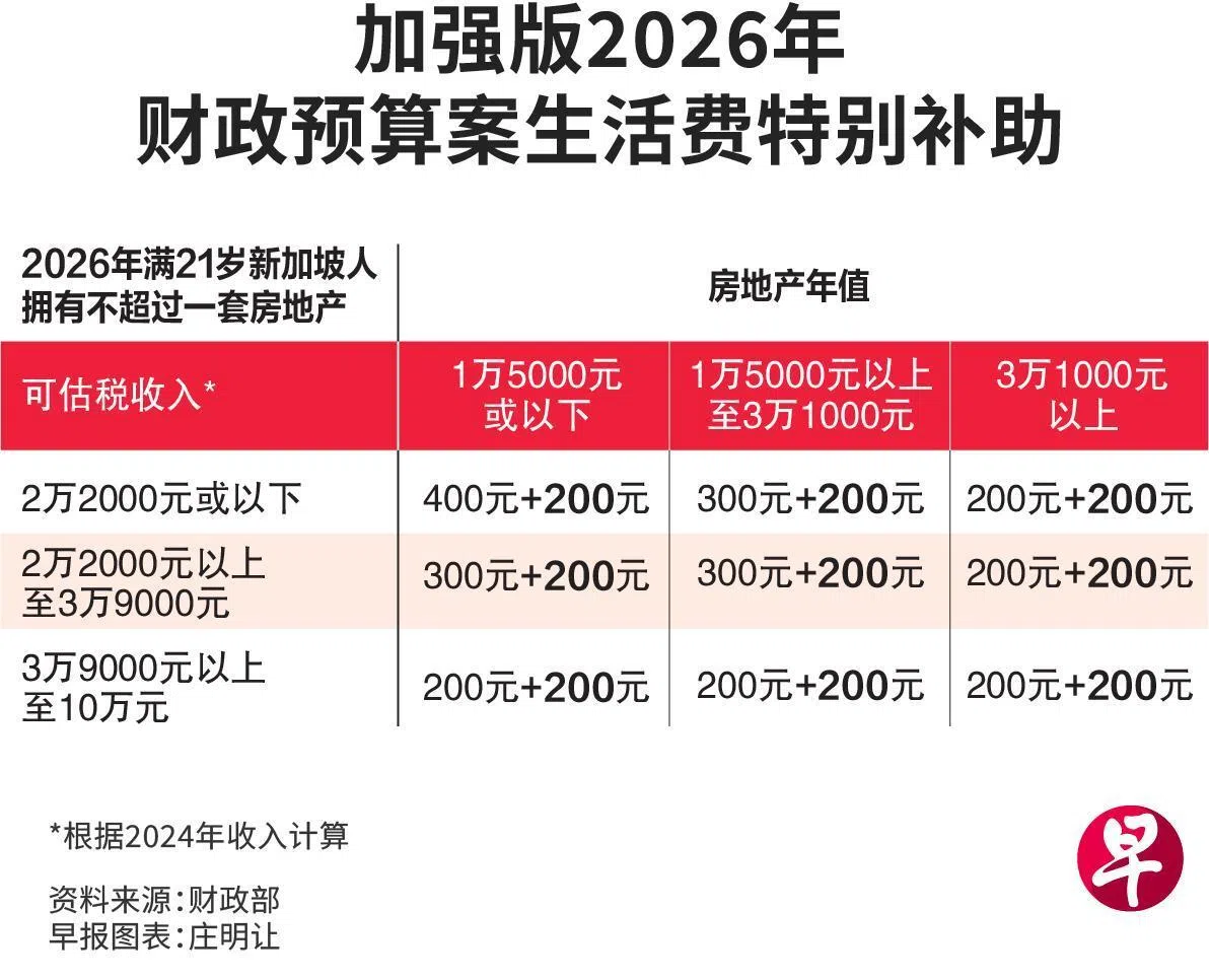 这意味着,符合条件的240万名新加坡人可获得的生活费特别补助总额增加到400至600元。
