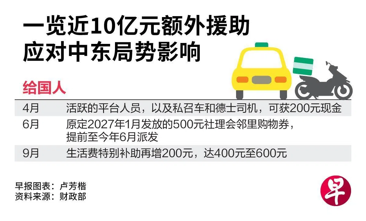 中东危机不太可能在短期内结束,我国必须做好准备,应对它造成的长远影响。政府推出近10亿元的援助配套,缓解局势对交通业者、企业和家庭的冲击。一揽子措施包括,提前在今年6月发放500元邻里购物券。