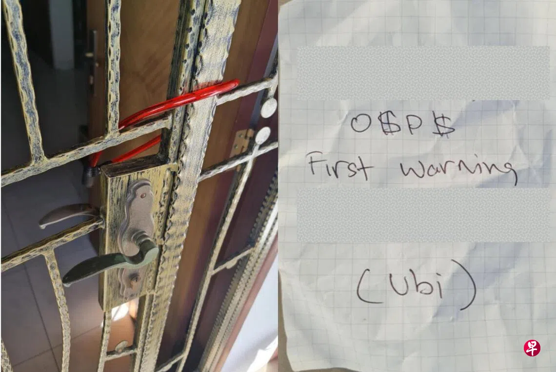 新加坡警察部队星期二(4月7日)发文告说,警方于星期一(6日)接获通报,指乌美一道(Ubi Avenue 1)和淡滨尼22街的两个住宅单位发生大耳窿骚扰事件,单位大门被脚踏车锁锁住,并被张贴讨债字条。