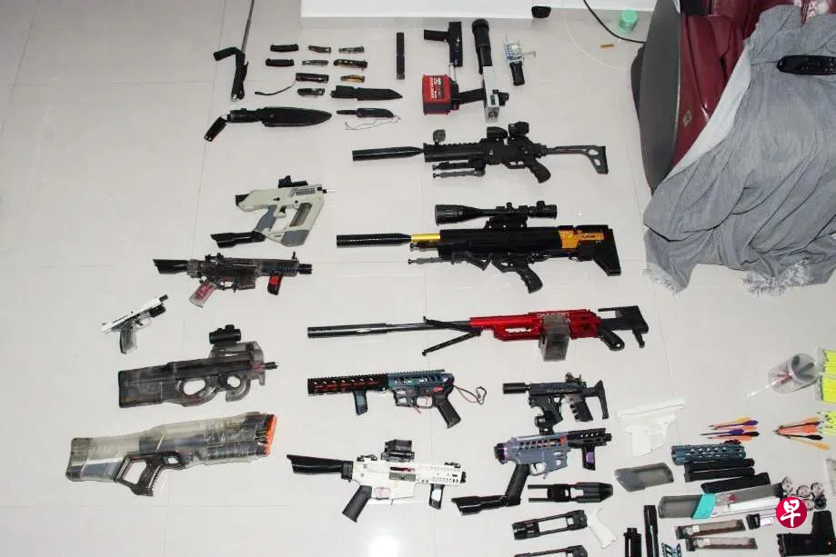 在逮捕人的同时,警员也从单位里起获大量武器及违禁物品,其中包括两把预充气式气步枪、四把玩具气枪、四把水弹枪、八把弓及36支箭、三把3D打印十字弓及83支箭、三个弹弓、九把弹簧刀、三把带鞘刀、一个电击装置、一根伸缩棍,以及多种弹射物。