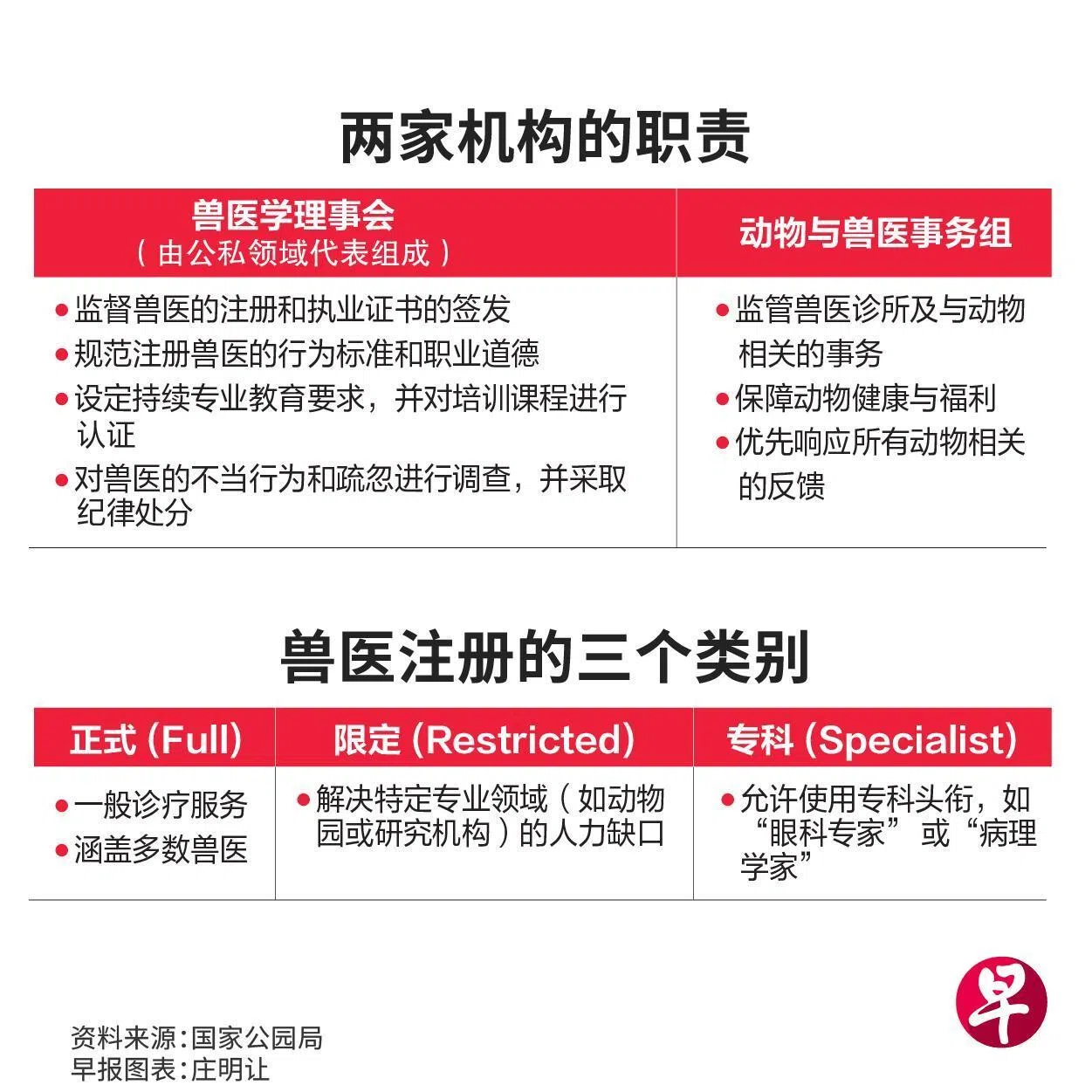 从2027年起,现有的执业兽医会进入一段过渡期,然后纳入新的注册框架。按新框架,本地兽医执照将分为三个注册类别:正式(Full)、限定 (Restricted)和专科 (Specialist)。