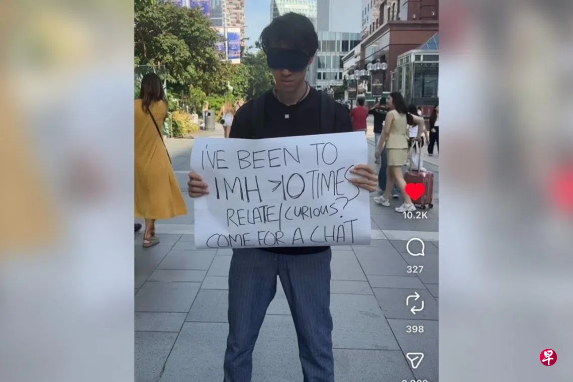 乌节路熙来攘往的人潮中,青年黄凯文(31岁)静静地举着一块告示牌——上面写着他曾超过10次入住心理卫生学院,许多路人放慢脚步观看,在网上也引发网民热议。