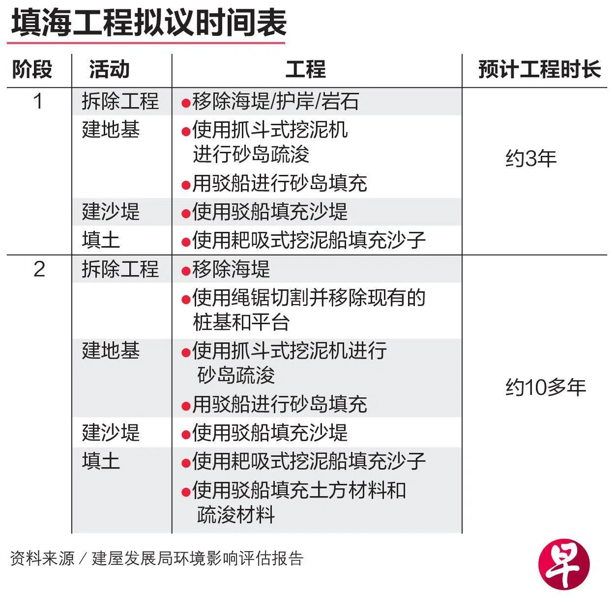 这包括拆除现有海堤和码头设施、兴建地基和沙堤,以及填土。