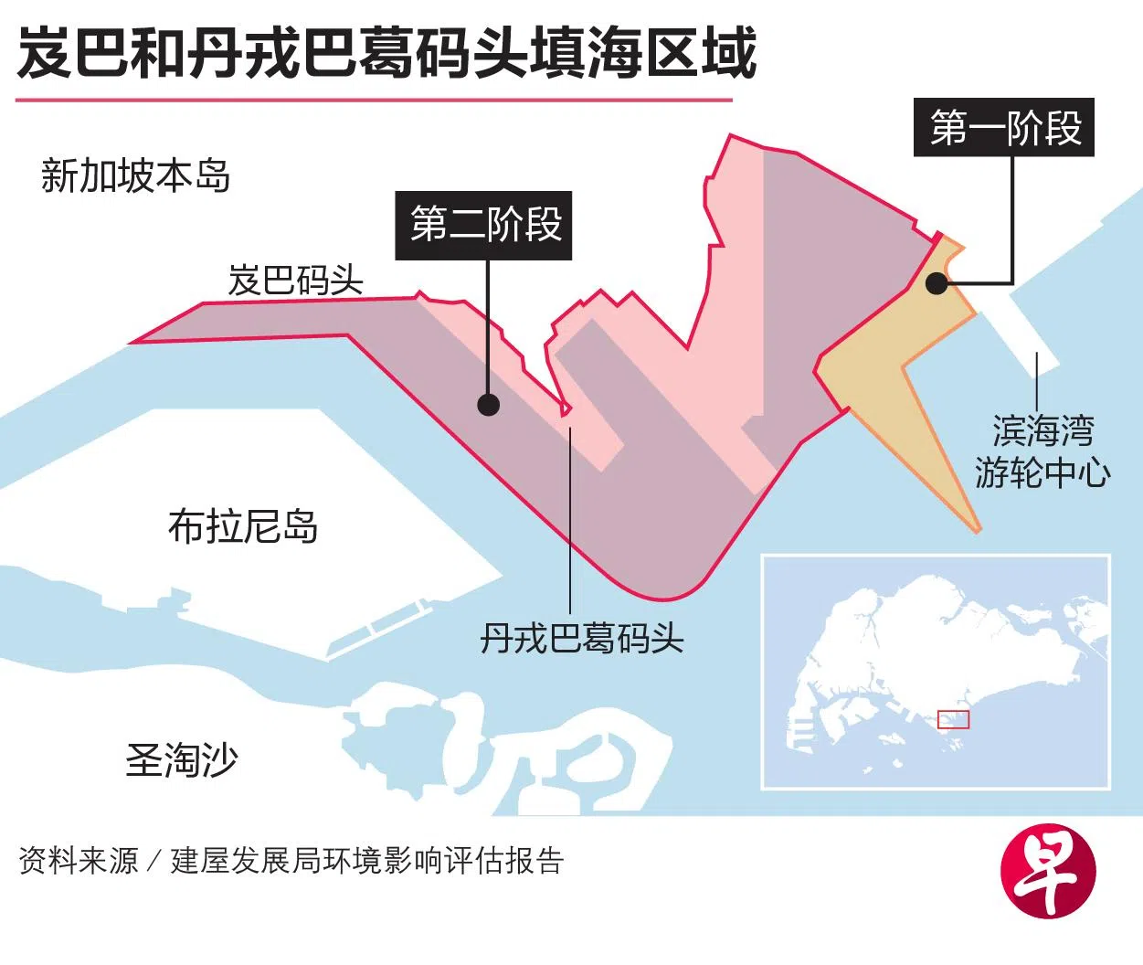 建屋局在官网发布这项填海工程的环境影响评估报告显示,工程将分两个阶段展开:第一阶段预计历时三年,将填充滨海湾游轮中心西南方向的一小片海域,形成一处尖型的突出陆地;第二阶段则将耗时超过10年,完成从丹戎巴葛码头至岌巴码头的主要填海工程。