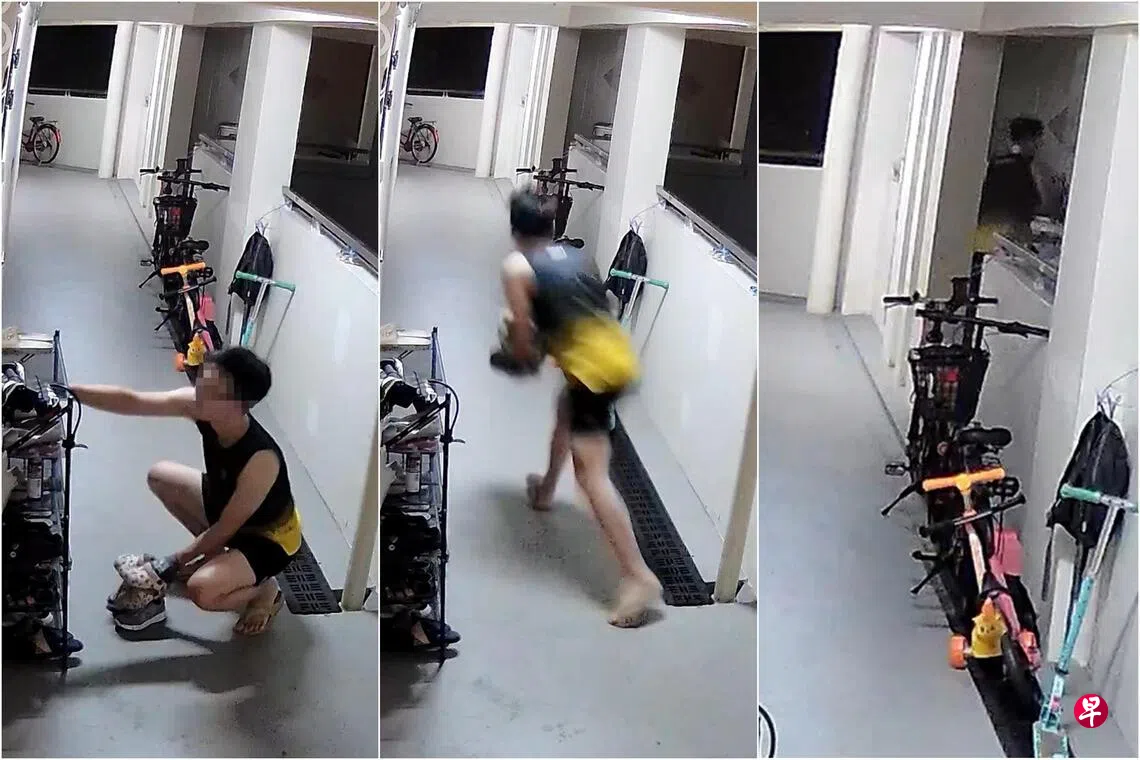 兀兰一户组屋人家放在门外的几双鞋子不见,屋主查看电眼录像,赫然发现有人将鞋子丢进垃圾槽。