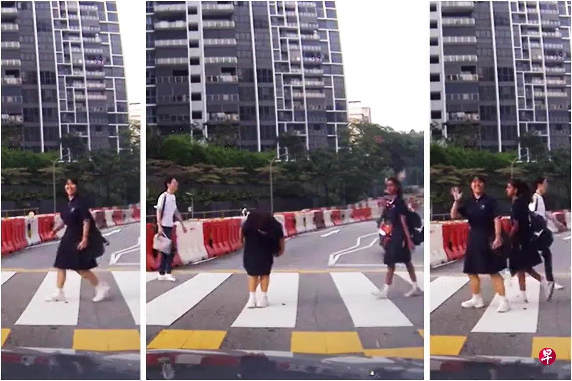 这段在网上流传的视频显示,在巴特礼一处斑马线前,一辆轿车缓缓停下让行人过路。一名女学生走到路中央时,忽然停下脚步,转身向驾驶员做了个90度鞠躬,然后微笑着挥手道别。
