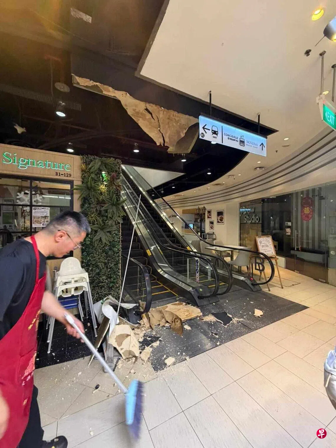 《联合早报》读者提供的照片显示,掉落的天花板板材砸在上行手扶梯的梯口,碎片散落一地。一名工作人员正在清理扶梯口和过道上的碎屑。