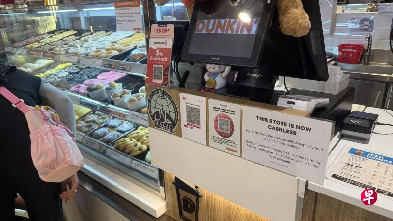 《新明日报》记者走访巴西立广场(Pasir Ris Mall)时发现,甜甜圈连锁店唐恩都乐(Dunkin’ Donuts)柜台同样放置“非现金付款”的告示。