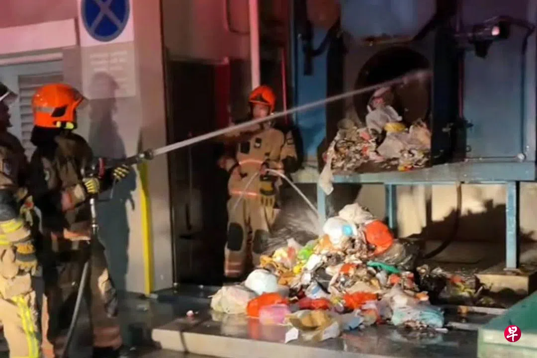 事发照片显示,至少有三名新加坡民防部队人员已在现场救援,并利用一支水枪对准垃圾压缩机的出口喷水。垃圾压缩机旁的地上也堆放不少垃圾,相信是民防人员到场后,为了进行灭火工作而将部分垃圾从压缩机中挖出。