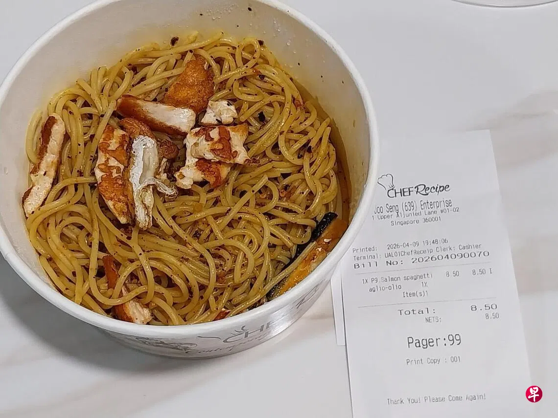 《新明日报》记者星期五(10日)走访上述咖啡店的西餐摊CHEF Recipe,也点了一份三文鱼意面。餐盒内约有七八小块三文鱼,意大利面分量正常。