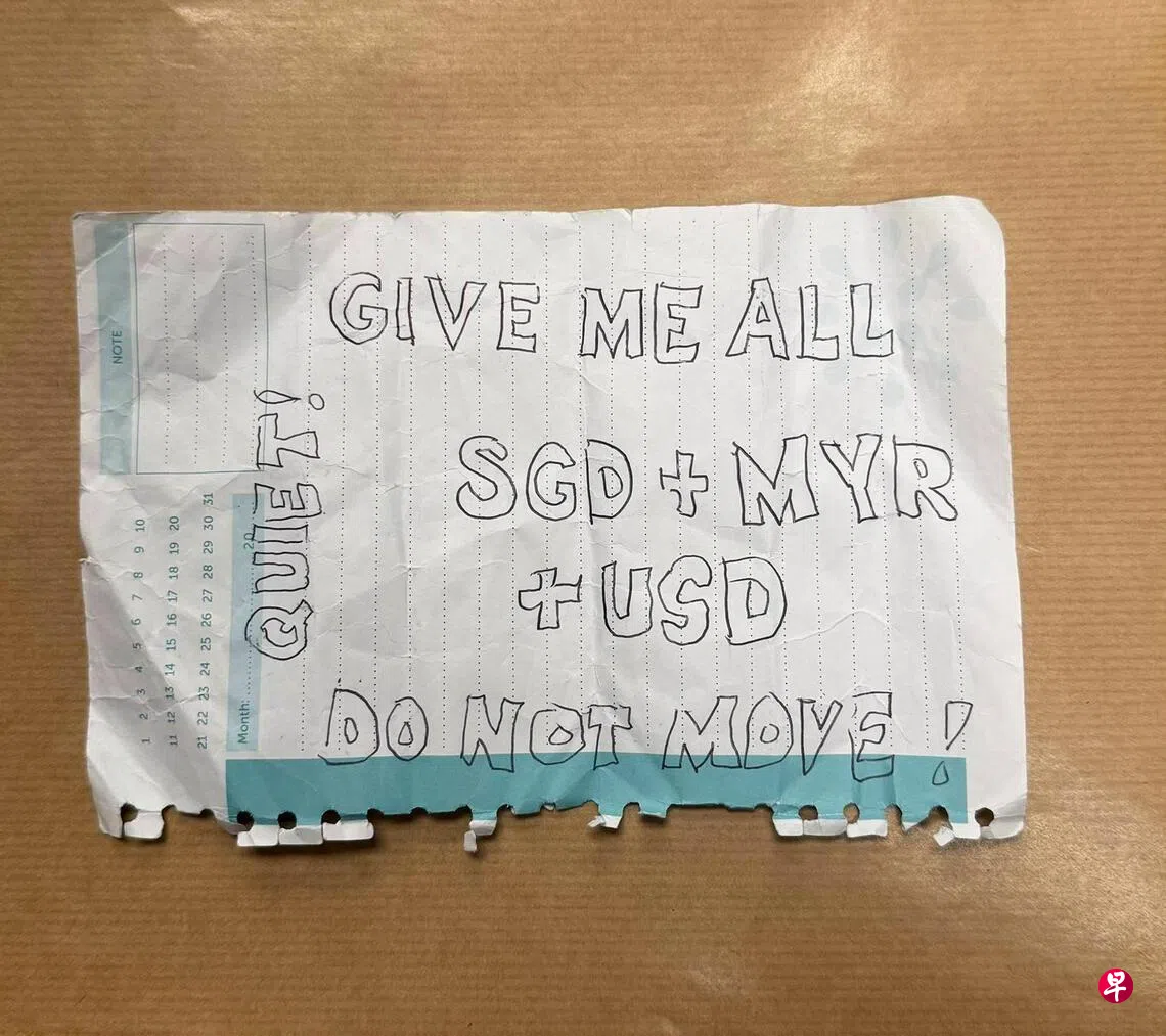 证物照片显示,字条应该是从记事本撕下的一页纸,上面写着“安静,别动,把所有新元、令吉和美元交给我”。