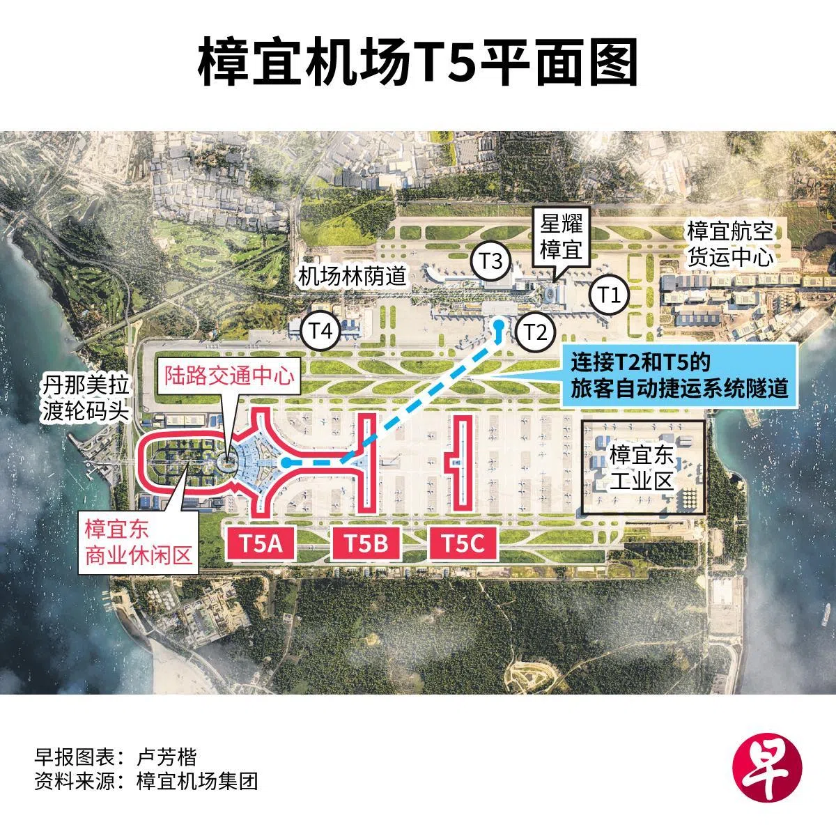 T5是樟宜东发展计划的项目之一,预计2030年代中期启用,每年可接待乘客多达5000万人次,可将樟宜机场总客容量扩增至1.4亿人次,扩大约56%。