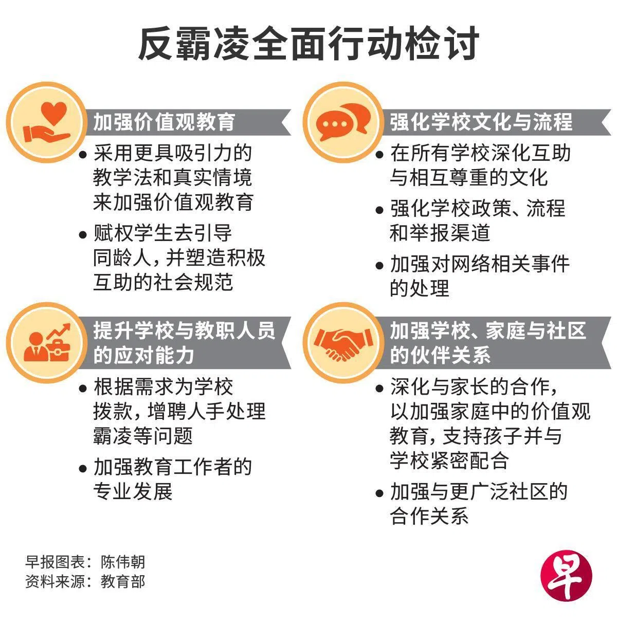 去年,本地几所学校陆续爆出霸凌事件。教育部去年8月透露,已于年初就防止霸凌行为展开全面检讨。检讨工作着重在四方面:强化学校政策、价值观教育、支持教育工作者,以及加强与家长的合作。除了内部检讨,教育部也于去年与超过2000名教育工作者、家长、学生和专业人士等交流,收集反馈。