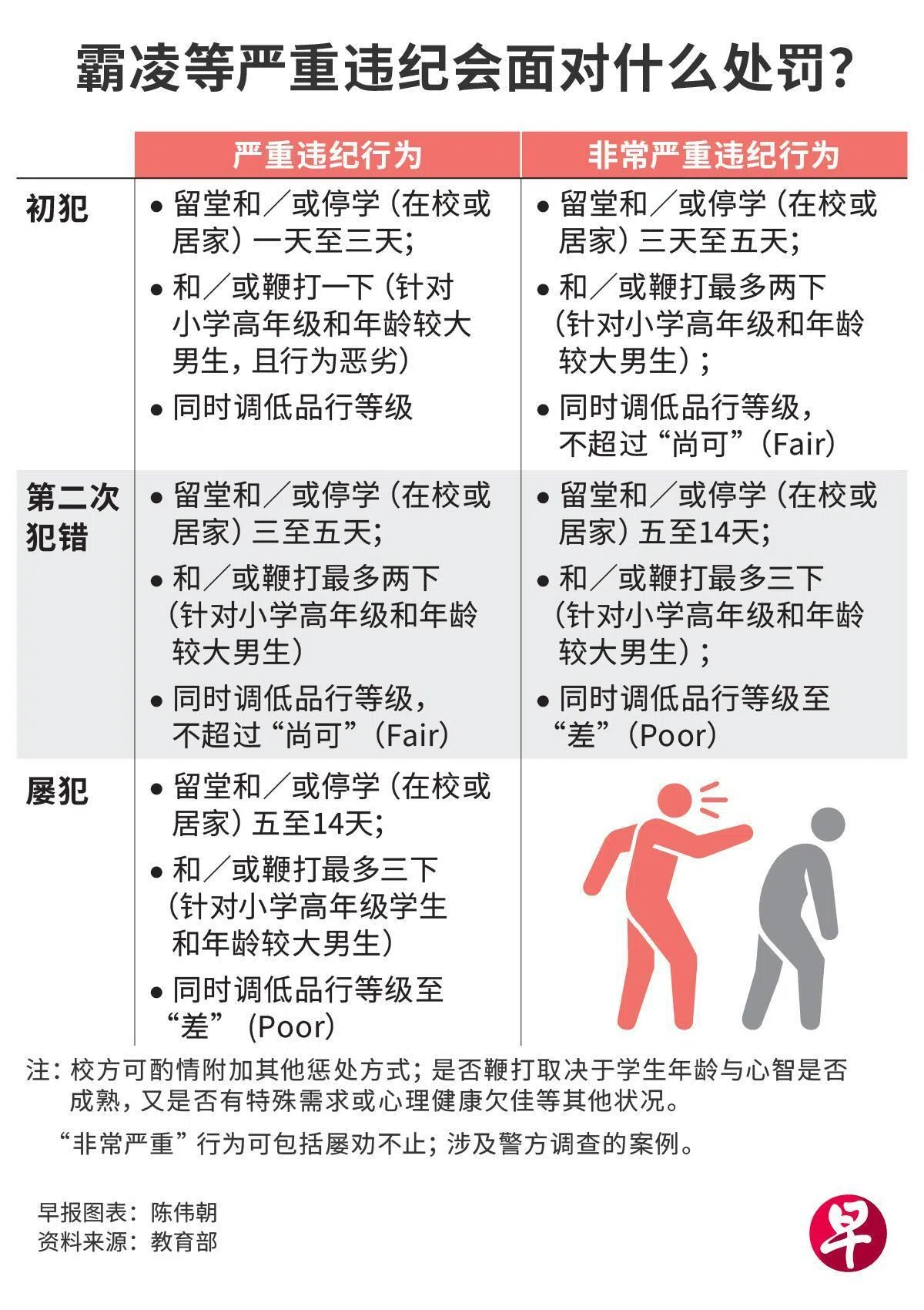 我国所有学校将最迟于2027年统一学生严重违纪的惩罚方式,采取一致的严格标准。校方也可根据需求获得资助,聘请额外人手协助教师处理霸凌等纪律问题。