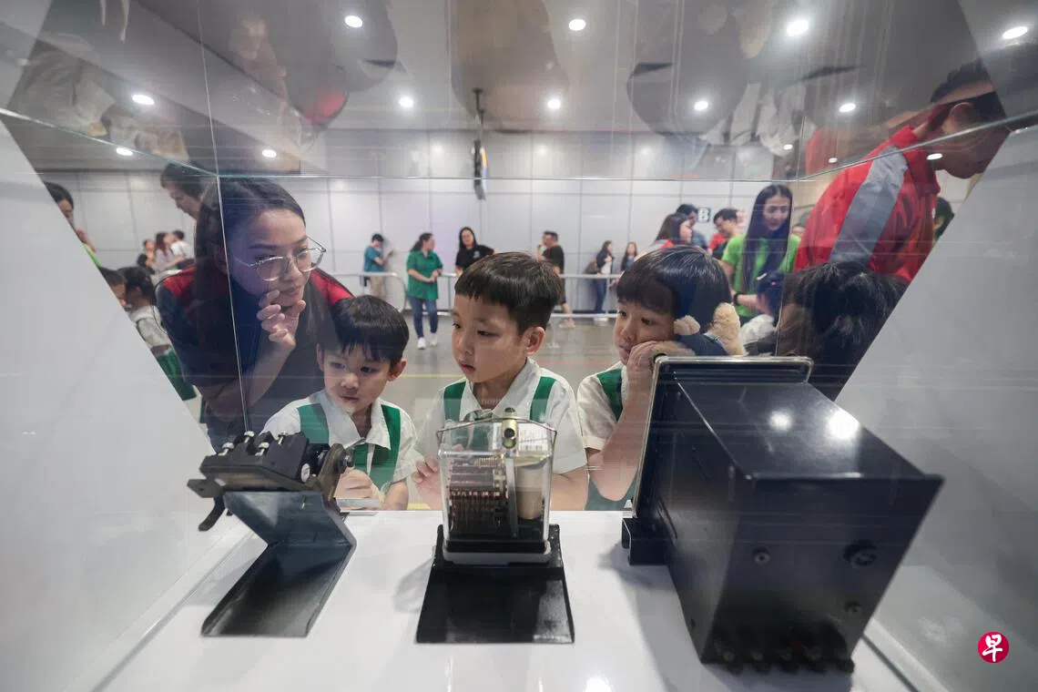 交通部兼国家发展部高级政务部长孙雪玲星期五为展览主持推介仪式后,在现场参观展示品,并听两名地铁工程师讲解不同部件的作用。
