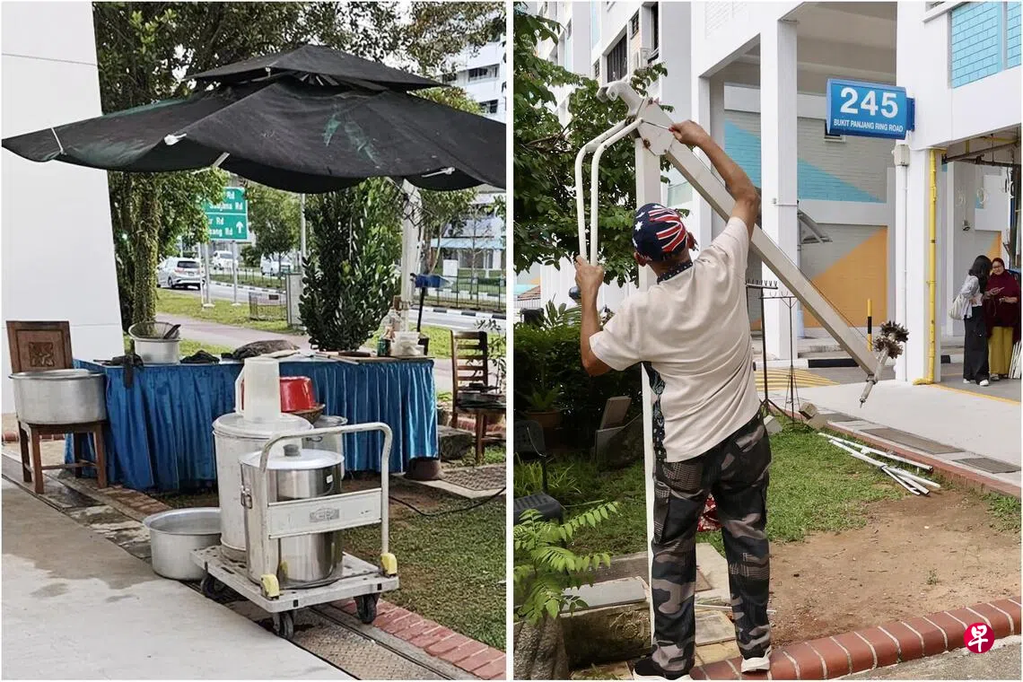 一名住在武吉班让环路的居民日前向网媒STOMP投诉,指这一路段第245座组屋底层的草坪上,有居民设立“户外厨房”,不仅搭起遮阳伞、摆放长桌,还有煤气罐、炉灶和数口大铁锅。