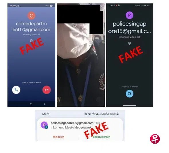 警方指出,受害者通常会接到来历不明的Google Meet视频通话,对方身穿警察制服,使用警察的徽章作为头像,并通过含有“Singapore”(新加坡)或“Police”(警察)等字眼的电邮地址联系受害者。