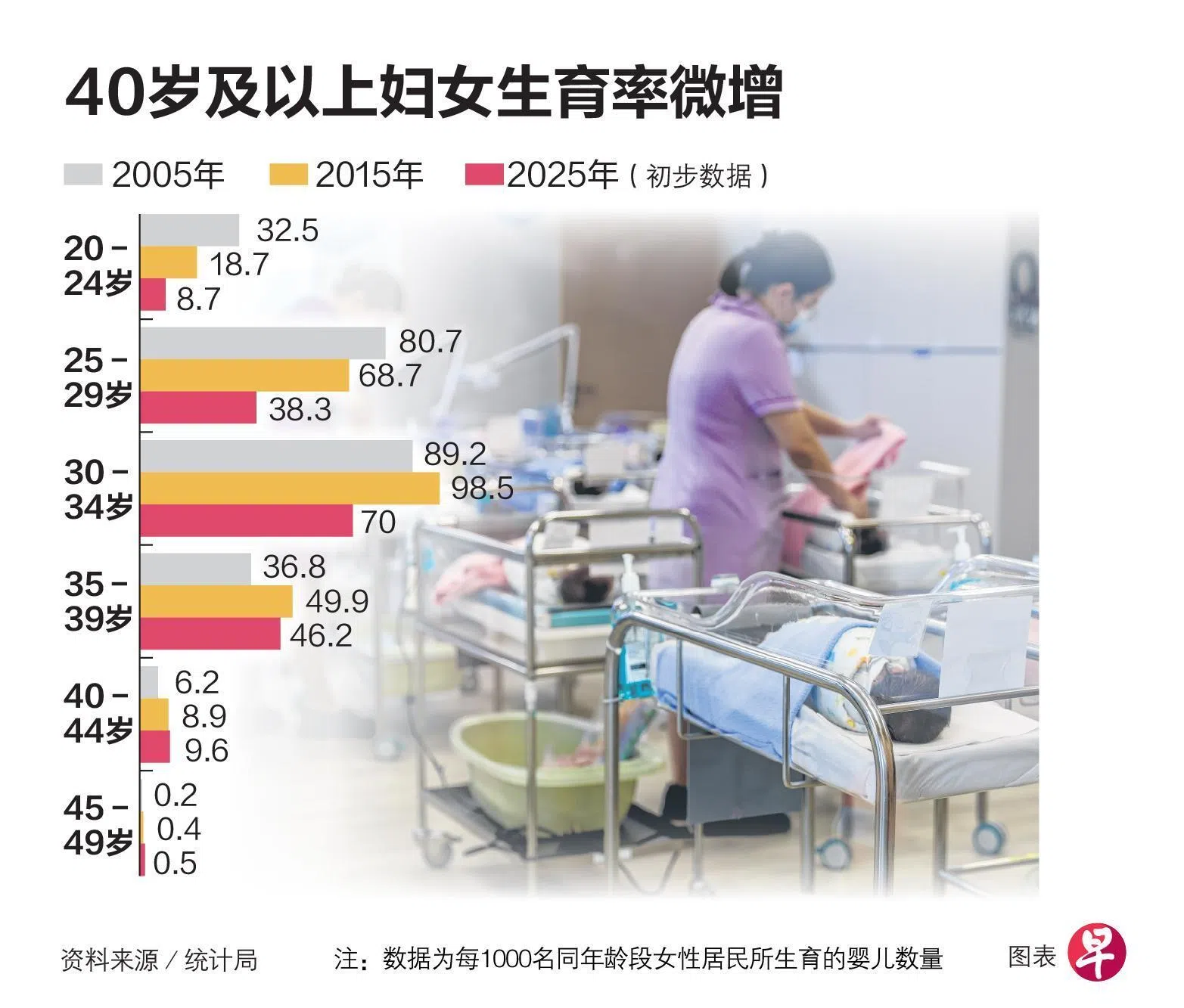 根据新加坡统计局今年2月更新的特定年龄组生育率(age-specific fertility rate,简称ASFR)初步数据显示,2025年,40岁至44岁的妇女当中,每1000人生育9.6名婴儿,比2005年的6.2名婴儿增加。特定年龄组生育率为某个年龄组中,每1000名同年龄段女性所生育的婴儿数量。