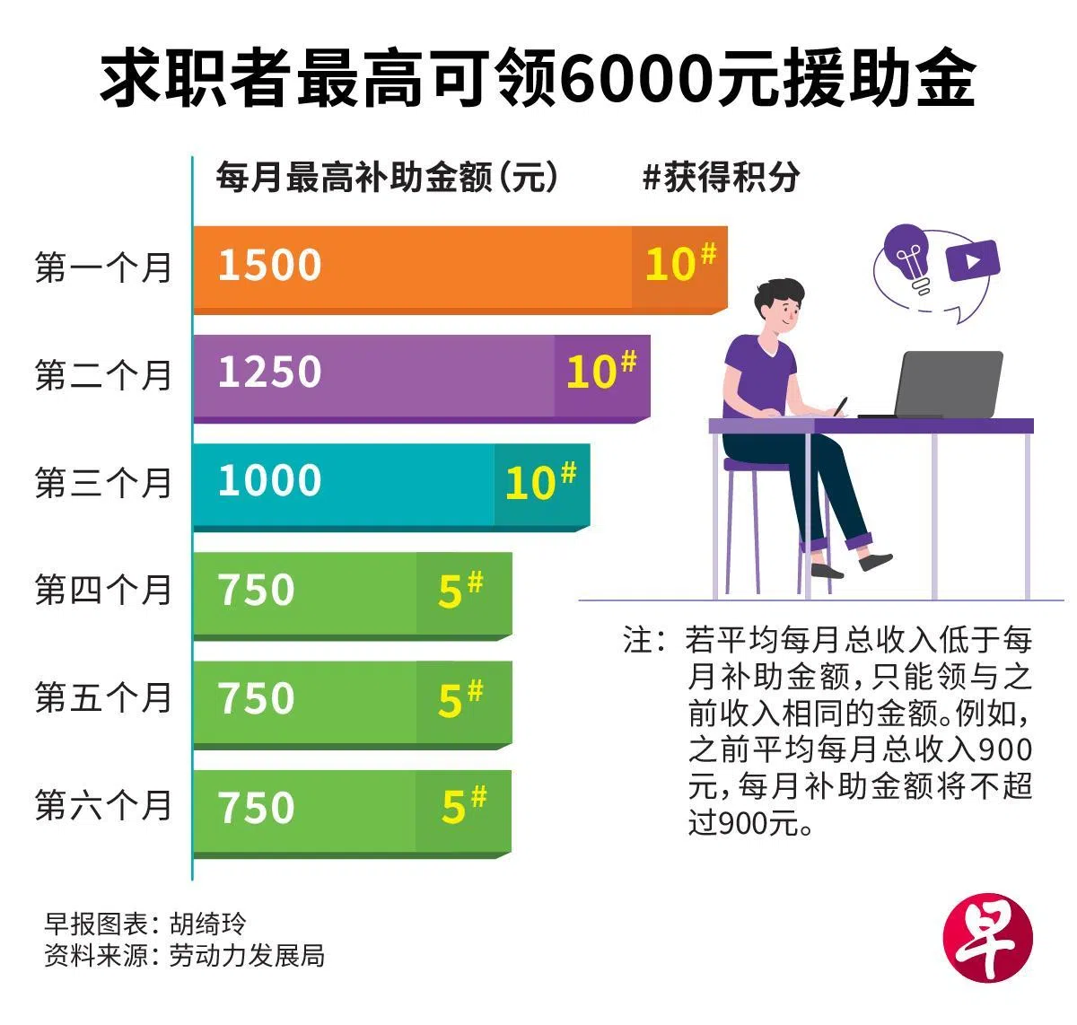 为期六个月的援助金,以分期和递减方式派发,符合条件者第一个月可领最多1500元。期间若求职者找到工作,就不可继续领援助金。
