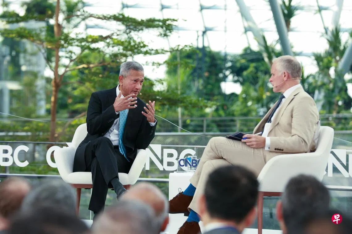 外交部长维文医生星期三(4月22日)上午参加美国消费者新闻与商业频道(CNBC)于星耀樟宜举办的CONVERGE LIVE研讨会,与CNBC节目主持人塞奇威克(Steve Sedgwick)进行了一场长约半小时的炉边对话。