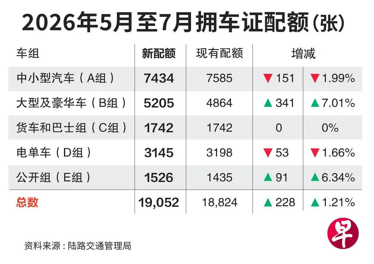 货车和巴士组(C组)配额持平,维持在1742张;电单车组(D组)配额则减53张(-1.7%),共3145张。