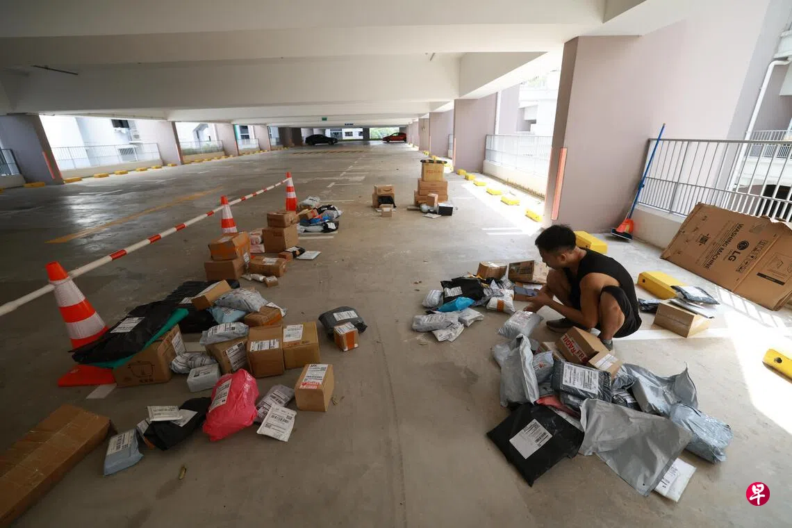 本报记者在数个停车场发现,一些不属于计划的多层停车场高楼或几乎没人经过的楼梯口,有外籍送货员在分拣包裹,准备派送到附近组屋单位。包裹上印有大型电商平台的字样。