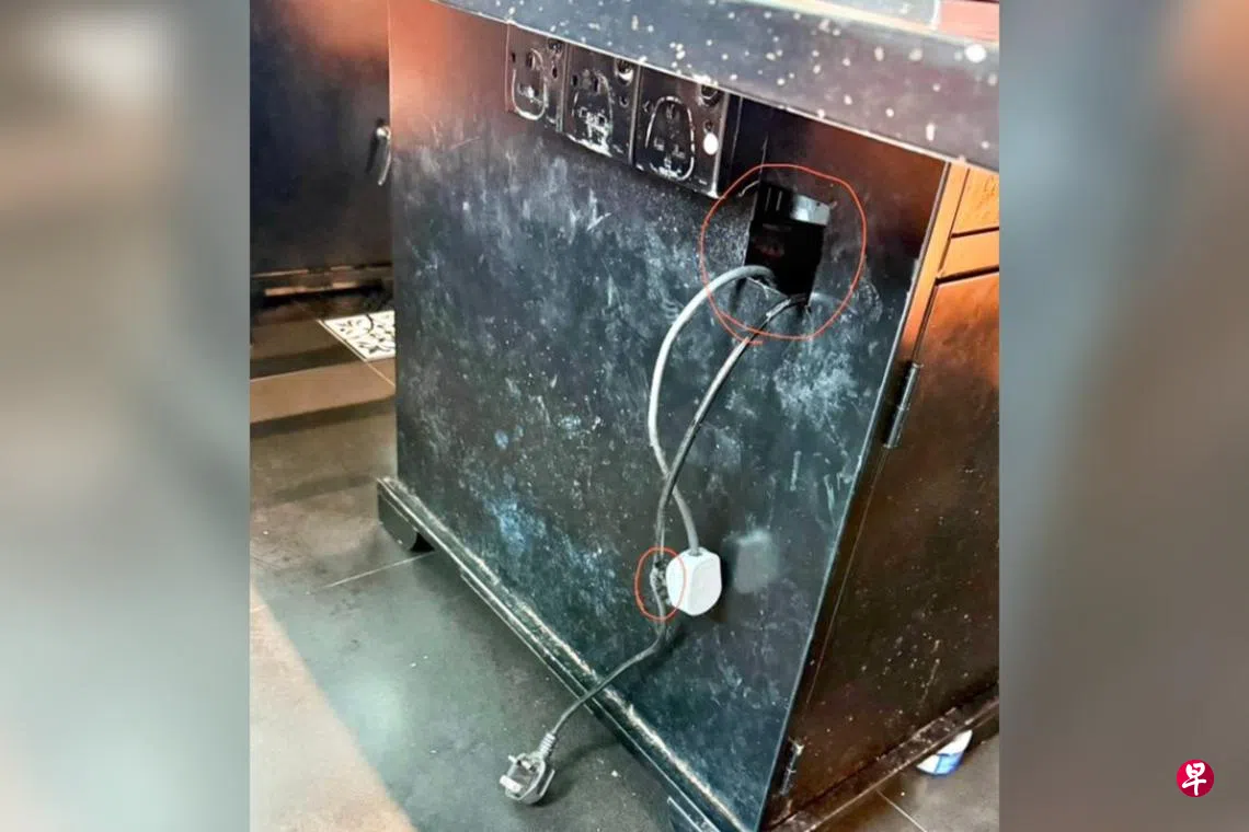根据她提供的照片,餐桌下方电线处的洞口、插头和外壁被熏黑,电线则已脱落。