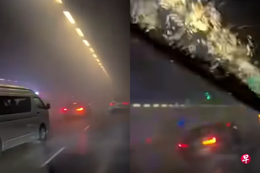 有网民事发时经过现场,行车记录器捕捉到隧道洒水器启动的一幕。根据视频画面,隧道里湿漉漉一片,大量水花不断从上端落下,如同下大雨。隧道最左侧车道停了数辆应急车辆,以备不时之需;不少电单车被迫停靠路肩,避免被淋湿,也有一些骑士换上雨衣后继续前行。