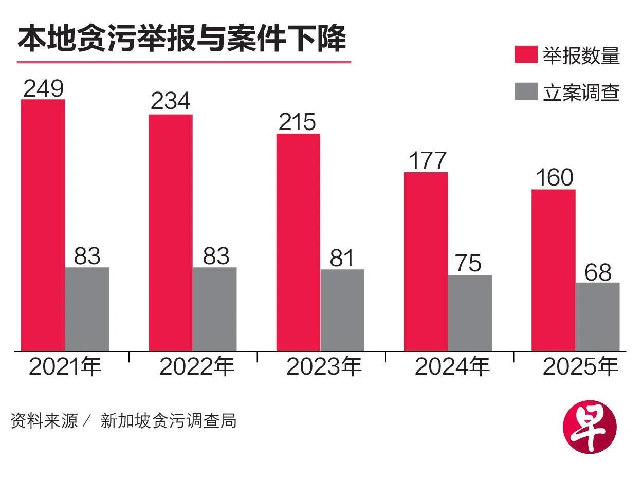 新加坡贪污情况继续被有效控制,贪污调查局2025年接获的贪污举报与立案数,双双写下新低;新立案件中,涉及公共部门的仅占1%。