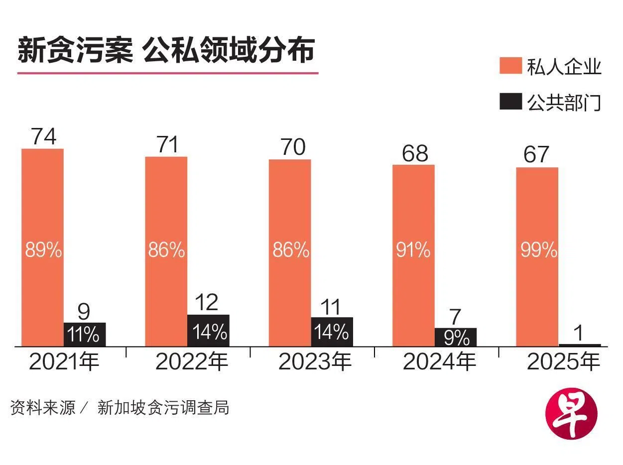 2025年,共有90人因涉及贪污案被控上庭,其中84人(94%)来自私人企业,六人(6%)为公共服务人员,包括来自环境局、新加坡武装部队、新加坡民防部队、监狱署,以及两所中学的职员。部分被提控者所涉案件是在2025年之前犯下。