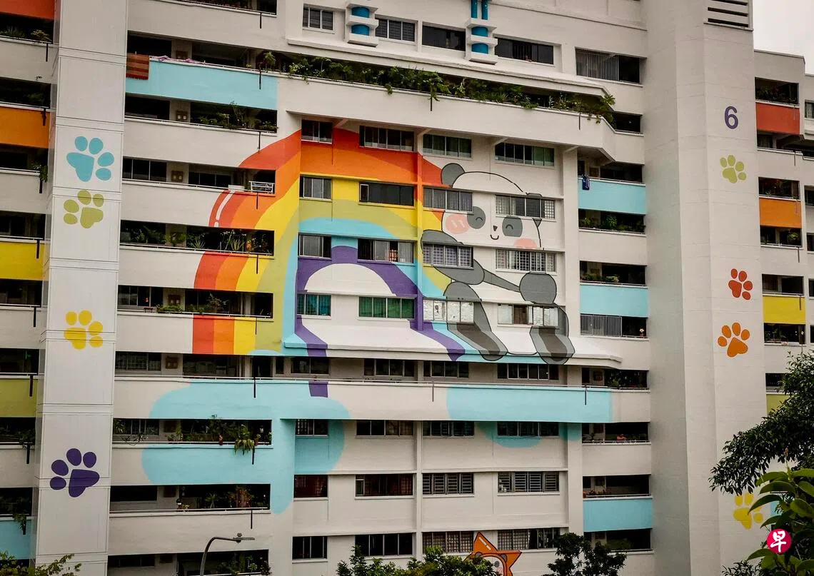 这七座组屋在个别楼层的外墙漆上了柔和的红、橙、黄、绿、蓝和紫色,层层递进,宛如彩虹。墙面上还绘有形态各异的卡通熊猫,有的手持气球,周围点缀着星星、云朵和猫爪图案。