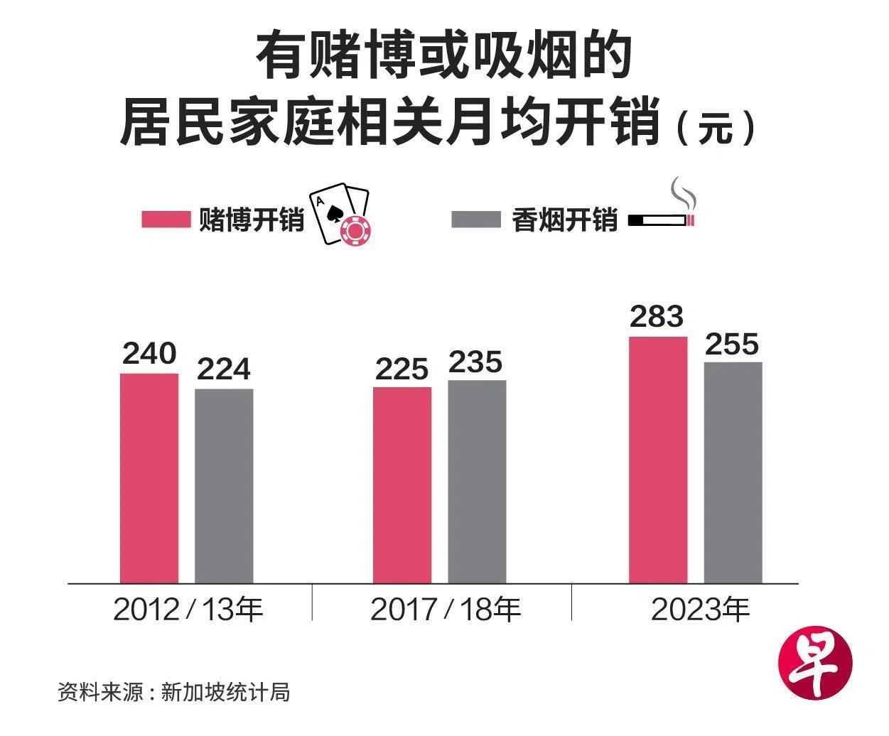 新加坡统计局星期三(4月29日)发布最新数据,对比2012年和2013年与2023年本地家庭在赌博和吸烟方面的支出情况。报告显示,有这两项支出的家庭比率较十年前明显下降。