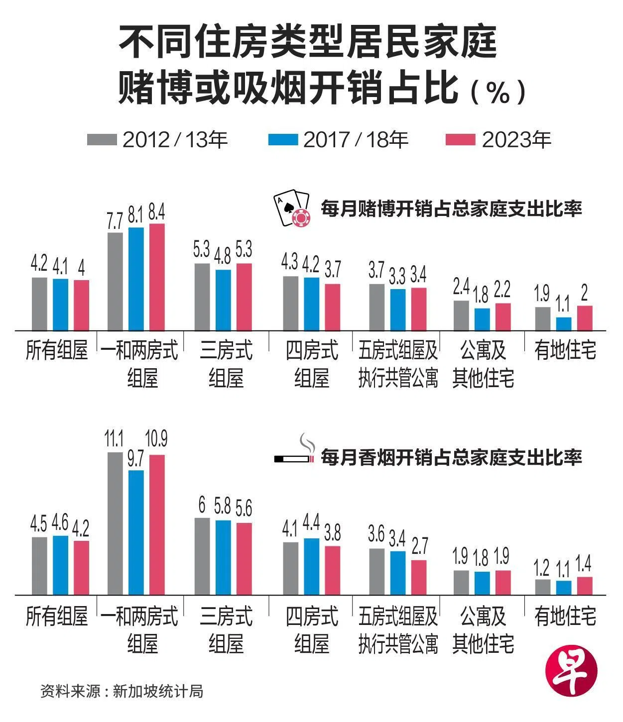 2023年,赌博和吸烟分别占了住在一房和二房式组屋家庭每月总支出的8.4%和10.9% ;相比之下,三房式或更大户型的赌博和吸烟支出占比,通常分别仅低于5.3%和5.6%。