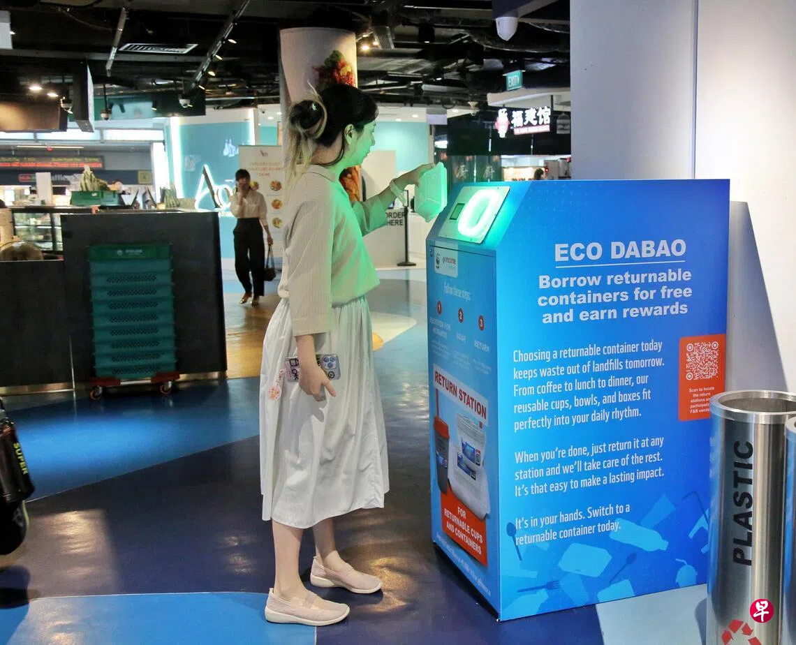 市中心上班族即日起购买外带餐饮时,可在指定店铺选择可重复使用的餐盒与饮料杯,并在用后归还至指定回收箱,减少一次性废弃物,为环保尽一分力。